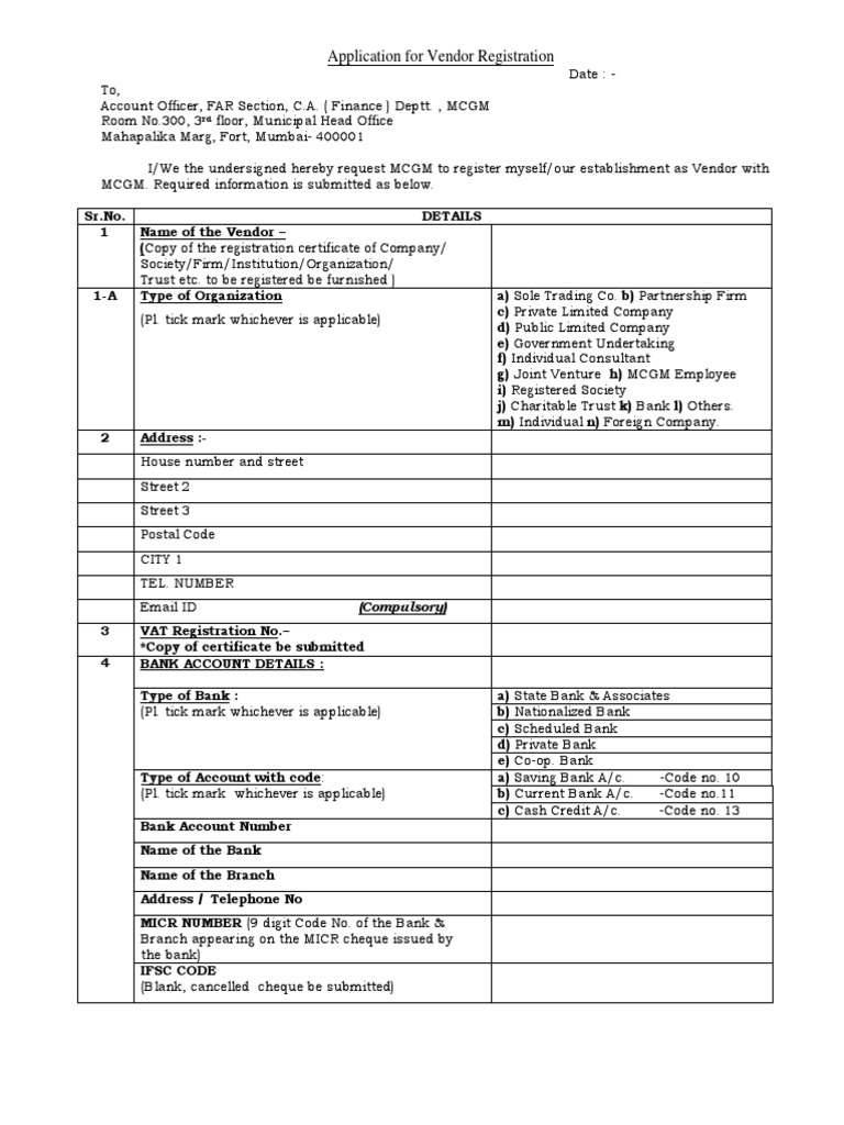 It is highly recommended that your company prepare in advance to meet the registration criteria for applying. Registration in the board's vendor database is voluntary. Registration provides the vendors an opportunity to make themselves known to board staff but declining to register will not affect the vendor's ability to participate in the solicitation process. Vendors must register in ipro to gain access to detailed solicitation information and to be eligible for a contract award. Business partners are directed to the portal, where they can register and respond to requests for information and documents. If any vendor wants to create another user account to submit alternate offer then kindly send the request to vendor.registration@fewa.gov.ae, and cc to. Wcmp creates a vendor registration page (with vendor_registration shortcode in its content) automatically upon activation. This vendor registration form template, like all of jotform's thousands of templates, are fully customizable and free to use. For being a vendor, the customer company assigns vendor code to your company. The following instructions apply to all vendors wishing to respond to solicitations issued by the osce secretariat in vienna. Vendor registration must be renewed annually. Indicate national identity card no. Assuming you are a vendor, i believe there is no harm in requesting a vendor registration process from the procurement team.